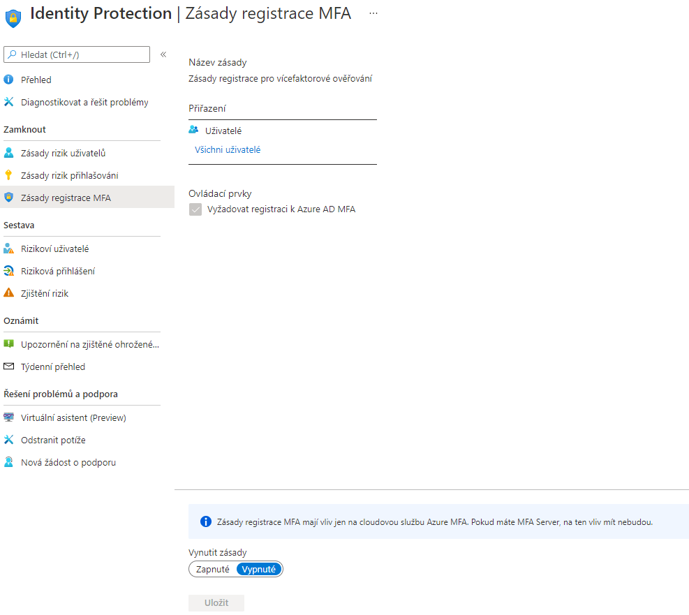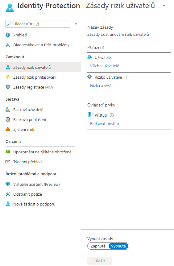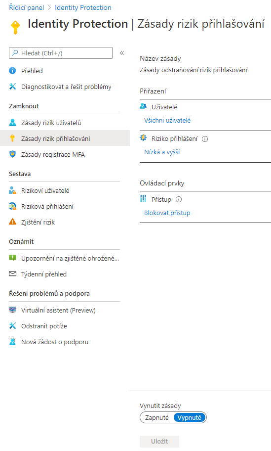 U zásady rizika přihlašování je změna pouze v parametru rizika přihlášení. Pokud přihlašovací údaje uniknou, tak se jedná o riziko vysoké. Jestliže se přihlašuje z: anonymní IP adresy, napadeného zařízení, neznámé lokace nebo lokace, do kterých je fyzicky nemožné se dostat, jedná se o riziko střední. Pokud se přihlašuje z IP adres, které vykazují podezřelé aktivity, jedná se o riziko nízké. Na konci pozor, provedené změny musíme uložit.