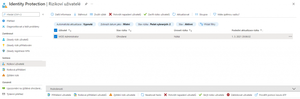 Pod nabídkou Sestava můžeme sledovat aktuální rizika. Na obrázku máme rizika uživatelů, kde se nám zobrazuje jméno uživatele, informace o uživateli, které jsou na spodní části stránky pod nabídkou s názvem podrobnosti, a informace o riziku. Také je zde možné na dálku uživatele zablokovat, změnit mu heslo nebo ho prověřit pomocí Microsoft Defenderu for Identity (studuj.digital).