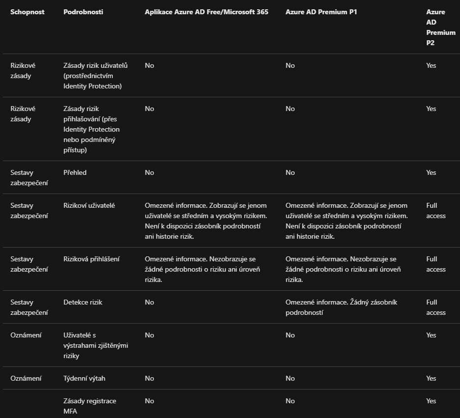 Jak můžeme z tabulky vypozorovat, tak pro všechny funkce potřebujeme licenci Azure AD Premium P2.