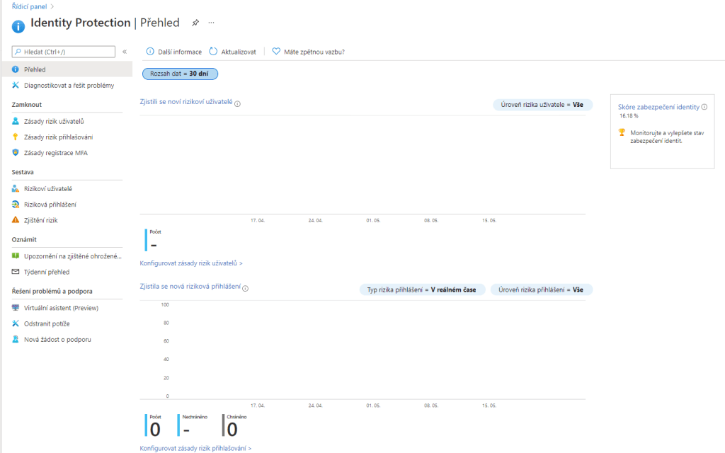 Jako první věc vidíme přehled. Tady se můžeme dívat na různé statistiky o rizicích uživatelů nebo přihlášení. Napravo se nachází skóre zabezpečení identit. Tento údaj nám jenom říká, jak jsme na tom se zabezpečením oproti běžným postupům, ale neříká, jak na tom se zabezpečením doopravdy jsme, jelikož je to pro každého individuální. Proto je důležité, aby všechno bylo řádně zabezpečené.