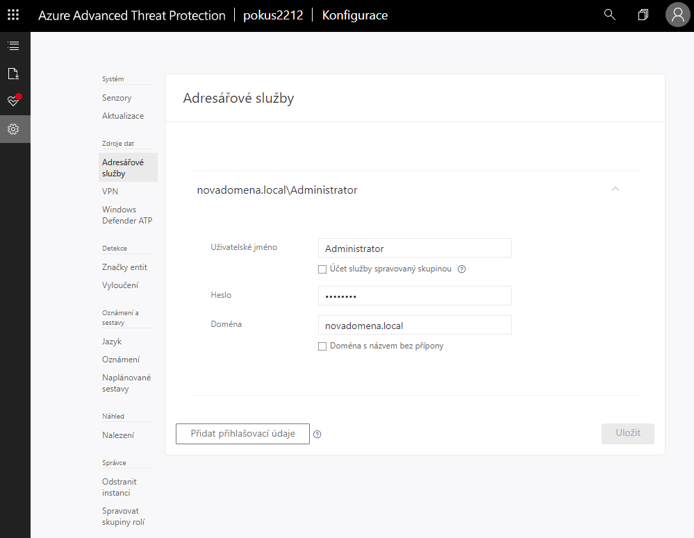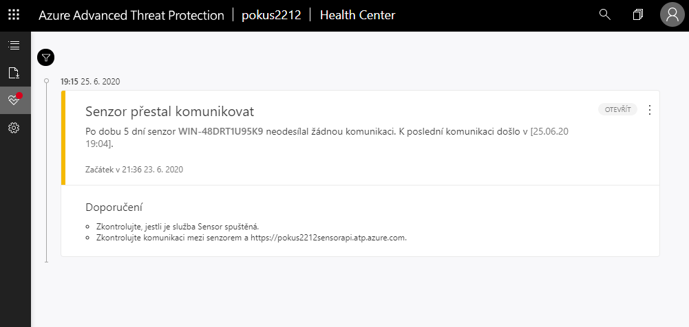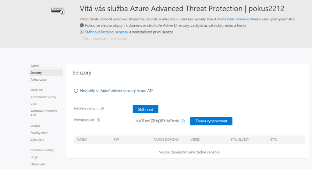 Nyní máme naistalovaný první senzor Azure ATP, který bude snímat aktivitu a zasílat signály.