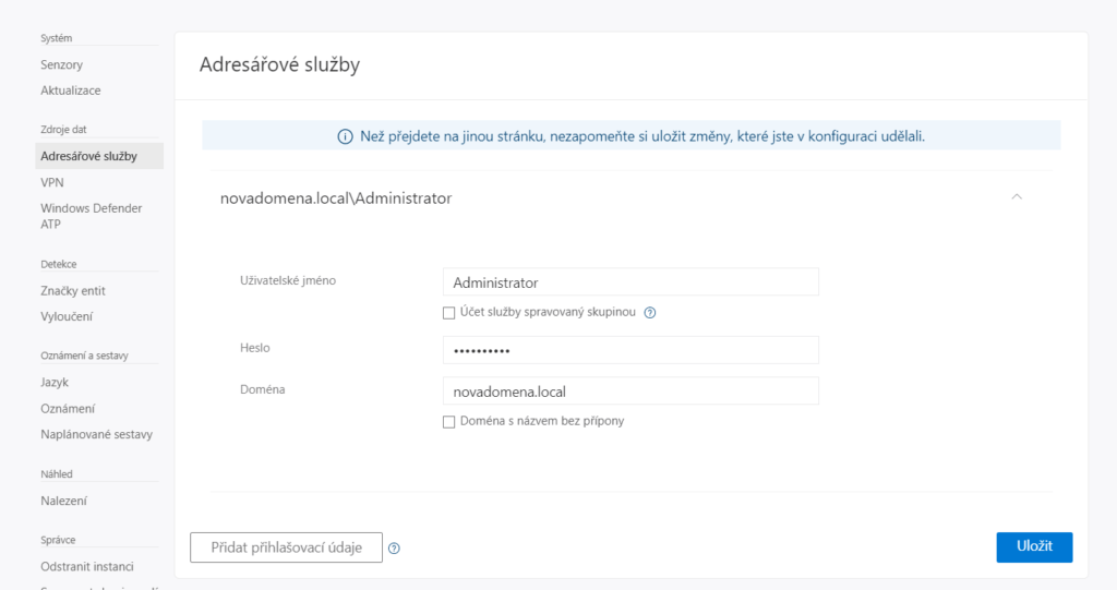 Nyní se budeme držet instrukcí, které jsou rozepsány pod vítací zprávou. Nejprve tedy zadáme uživatelské jméno a heslo od administrátora, který spravuje naši síť a kde chceme Azure ATP nainstalovat. Místo, kam tyto údaje napsat, najdeme pod položkou Adresářové služby.