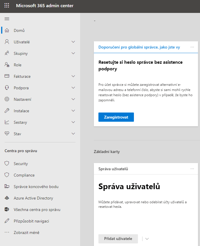 Poté, co klikneme na Správce, se nám otevře Microsoft 365 Admin center. Nachází se tu spousta možností pro administrátory.