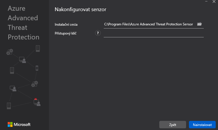 Poté budeme muset nakonfigurovat senzor. Zde určíme instalační cestu senzoru a vložíme sem Přístupový klíč, který nalezneme na stejném místě, kde jsme senzor stáhli - tudíž v rozhraní Azure ATP, podsložka Senzory. Po vložení spustíme instalaci.
