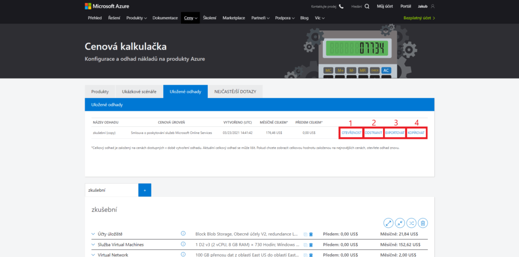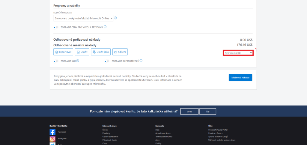 - Jako další krok doporučujeme si pod konfigurací zvolit vyhovující měnu (1). Poté si odhad můžete Exportovat – do excelu, Uložit – na svůj účet, Uložit jako – na svůj účet s možností přejmenovat nebo Sdílet – pomocí odkazu.