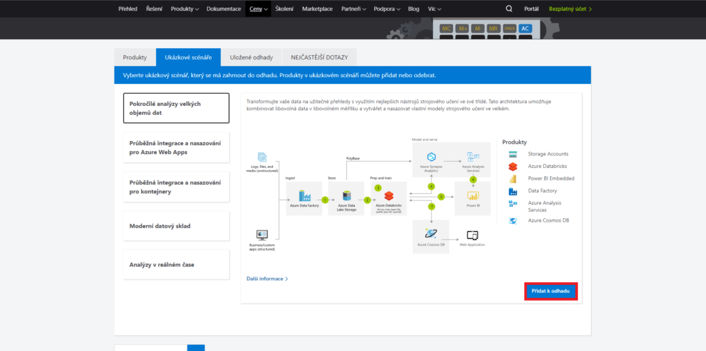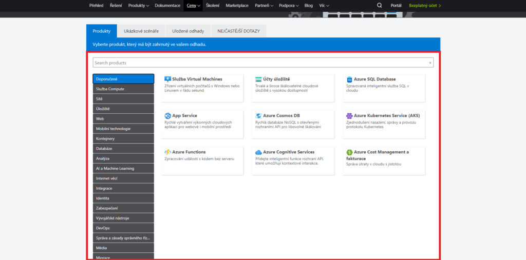 - (Pokud vám některý z ukázkových scénářů zcela vyhovoval, tak tento bod přeskočte.) V sekci Produkty navolte veškeré/zbylé (pokud se některý z ukázkových scénářů velmi podobal) produkty. Naleznete zde vše od Azure SQL Database po Azure Cognitive Services.