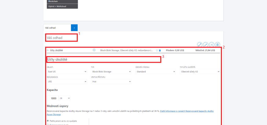 - Poté v sekci Produkty sjeďte dolů pod výběr produktů. Zde si svůj odhad můžete pojmenovat (1), a nakonfigurovat (2). Pro větší přehlednost si můžete přejmenovat i jednotlivé produkty (3).