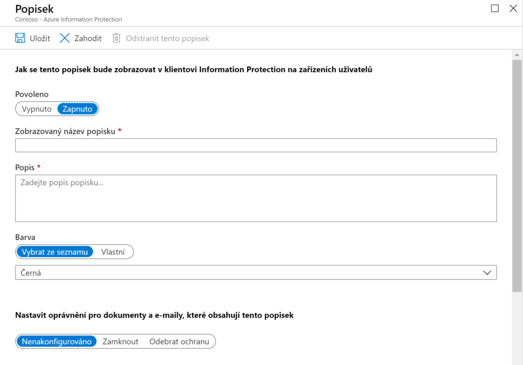 Administrátor zde může zvolit například výchozí popisek, který bude aplikován na dokumenty. Dále zde může nastavit, zdali bude muset uživatel odůvodnit odstranění nebo změnu popisku.