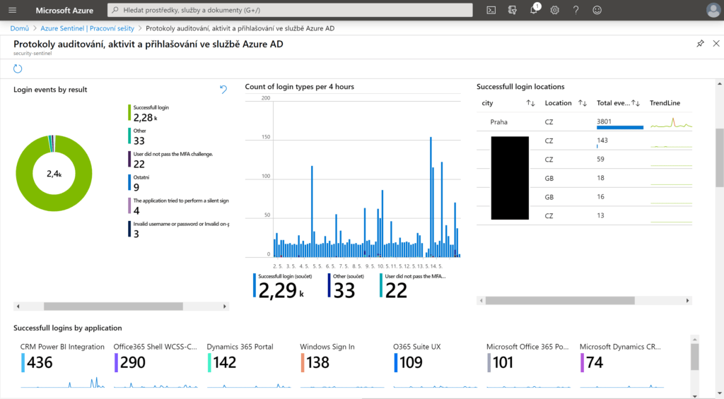 Uvedeme si příklad: Organizace sbírá data o tom, kde a jak se uživatele přihlašují. Z těchto dat chce následně určit, zda se někdo neautorizovaný nepokouší přihlásit do systému organizace. Služba Azure Sentinel uloží daná data do služby Log Analytics Azure Monitor. Přes konektory si organizace propojí Azure Sentinel s Azure Active Directory a v Doporučených sešitech si zvolí Azure Active Directory Sign-in logs. Tento sešit si může případně upravit dle svých představ. Nyní již Azure Sentinel hledá neobvyklé pokusy o přihlášení. Přehled nalezených hrozeb se zobrazí v pracovním prostoru Log Analytics.