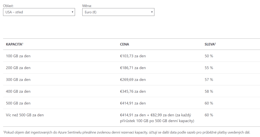 Příklad cen za rezervaci kapacity (k datu 7.3.2020, pro aktuální cenu se podívejte na ceník Azure Sentinel)