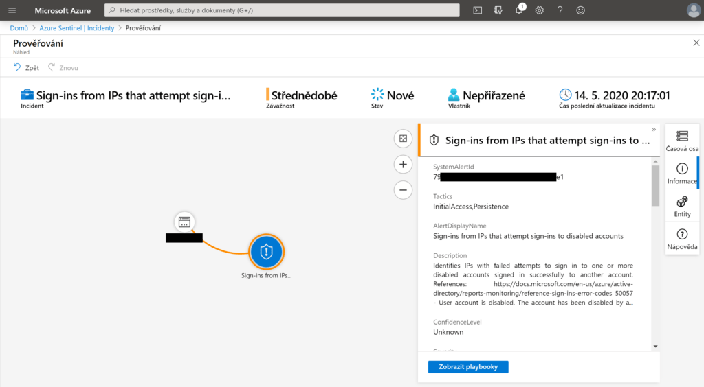 Pomocí cesty Incident-Prozkoumat se dostaneme do části služby Azure Sentinel, která nám umožní provést identifikaci základní příčiny problému či události. Služba zobrazuje data pro lepší přehlednost interaktivně v grafech, a to bez nutnosti psaní složitých detekčních dotazů. Protože útoky mohou být značně komplexní, je nutné každé detekční pravidlo řádně testovat a kontrolovat jeho funkčnost.