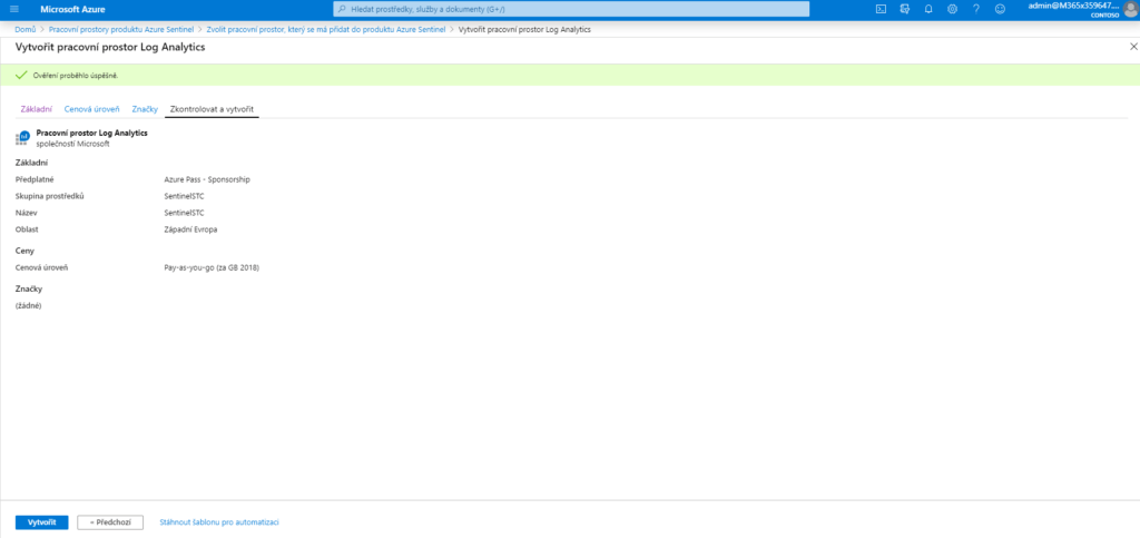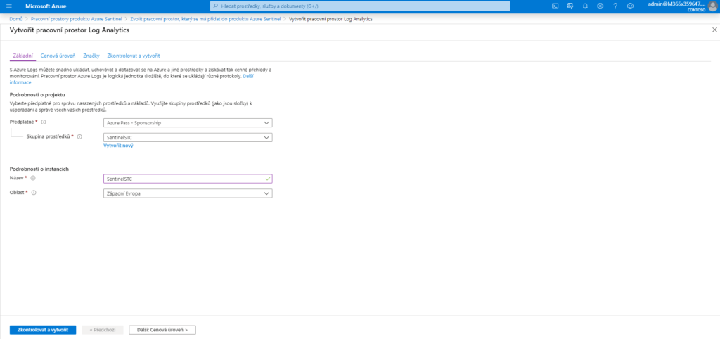 Pro vytvoření pracovního prostoru Log Analytics je nutné vybrat předplatné a zvolit či vytvořit skupinu prostředků (kolekce prostředku, které sdílejí stejné oprávnění a zásady). Dále je nutné zadat název pracovního prostoru a oblast, která je pro vás výhodná. Po vyplnění všech polí zvolte Zkontrolovat a vytvořit.