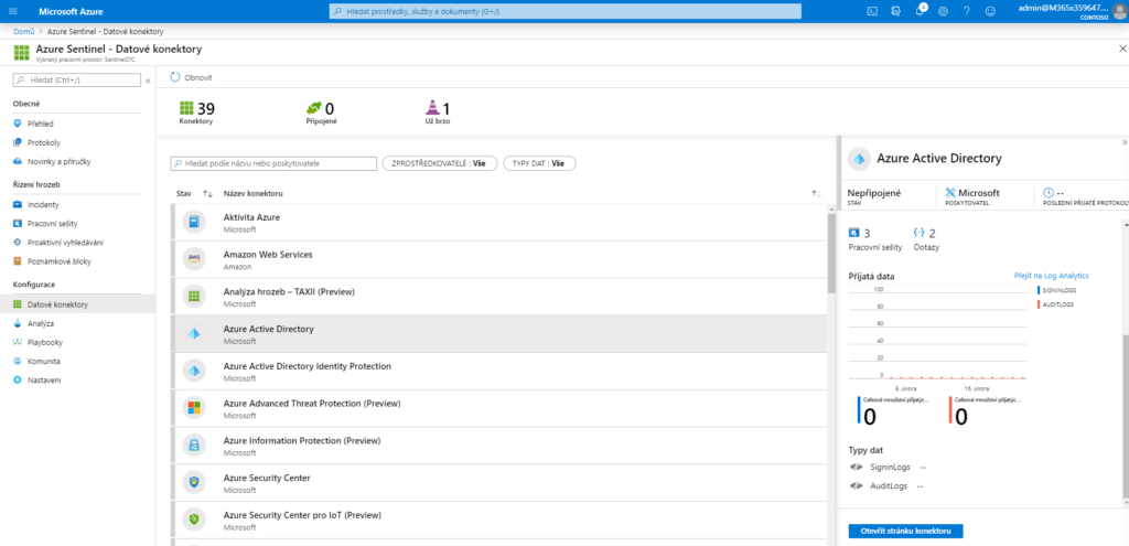 Aby bylo možné využívat služby Azure Sentinel, musíte ho nejdříve připojit ke zdrojům dat. V našem případě se budeme připojovat na AAD (později přidáme i další konektory) – proto vybereme Datové konektory a klikneme na Azure Active Directory.