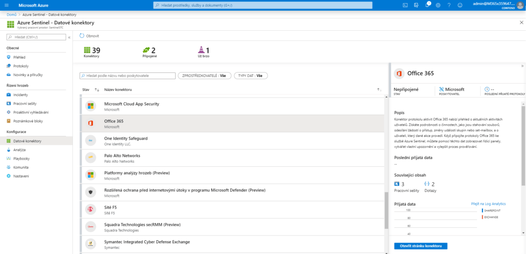 Nyní si ukážeme propojení dat z Office 365. V levé lište vybereme v sekci konfigurace Datové konektory. Následně nalezneme v seznamu Office 365 a klikneme na Otevřít stránku konektoru.
