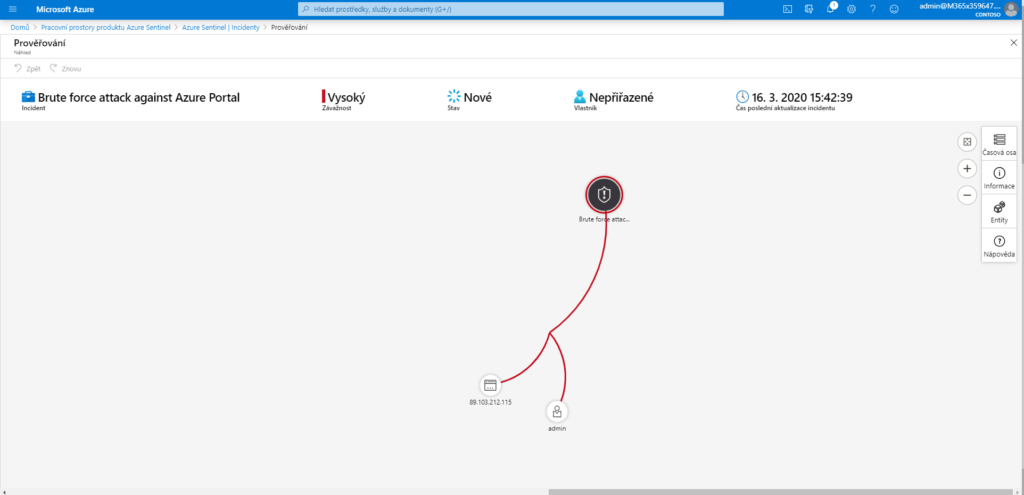 Kliknutím na tlačítko Prozkoumat se dostaneme na detail incidentu. Zde vidíme několik věcí – hlavně však mapu útoku. Na té můžeme pozorovat daný incident a různé vazby na něj.