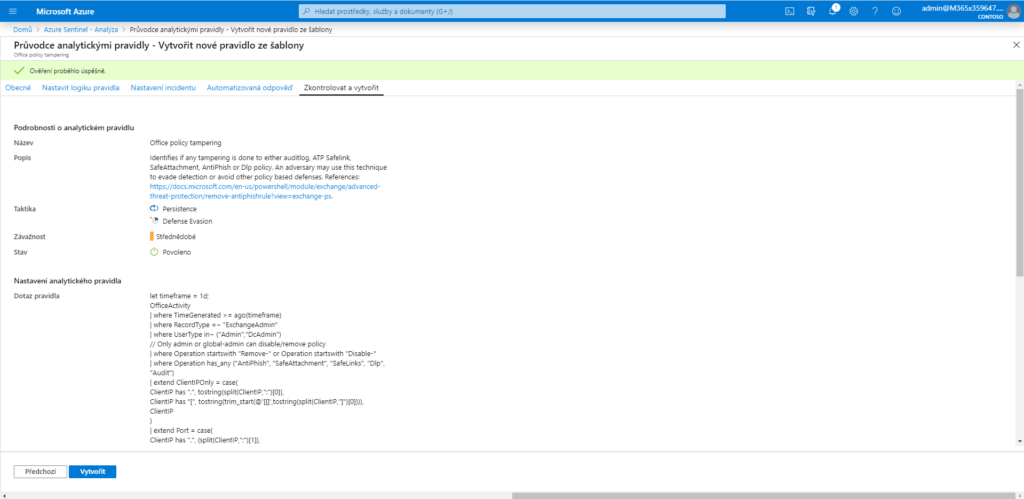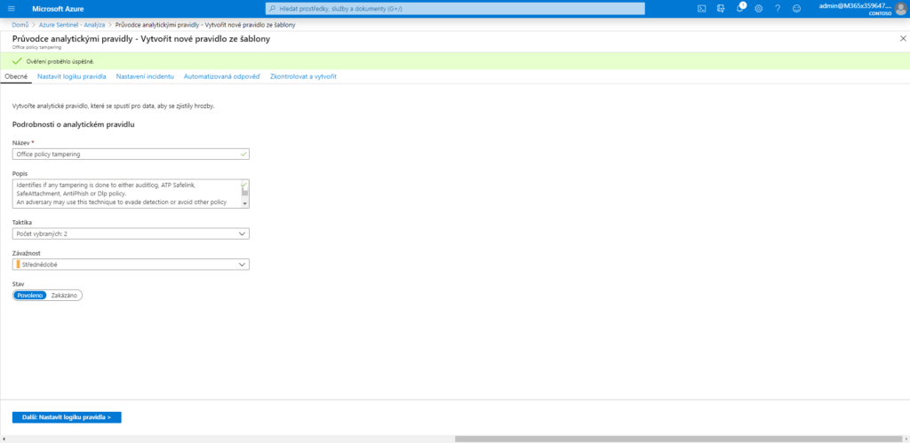 Např. zde jsme si našli pravidlo Office policy tampering. Kliknutím na něj se nám ukáže několik věcí – jeho popis, závažnost, či s jakými zdroji dat pracuje.