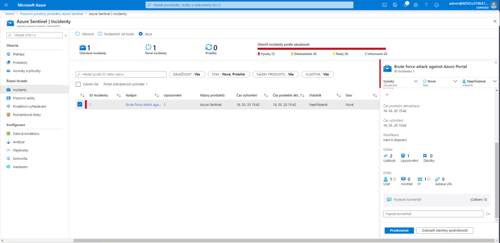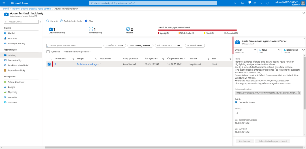 Poté, co se poruší některé z pravidel, která jsme nastavili výše v kroku Azure Analýza, vytvoří se Incident. V záložce incidentů nalezneme podrobnosti o jednotlivých incidentech.