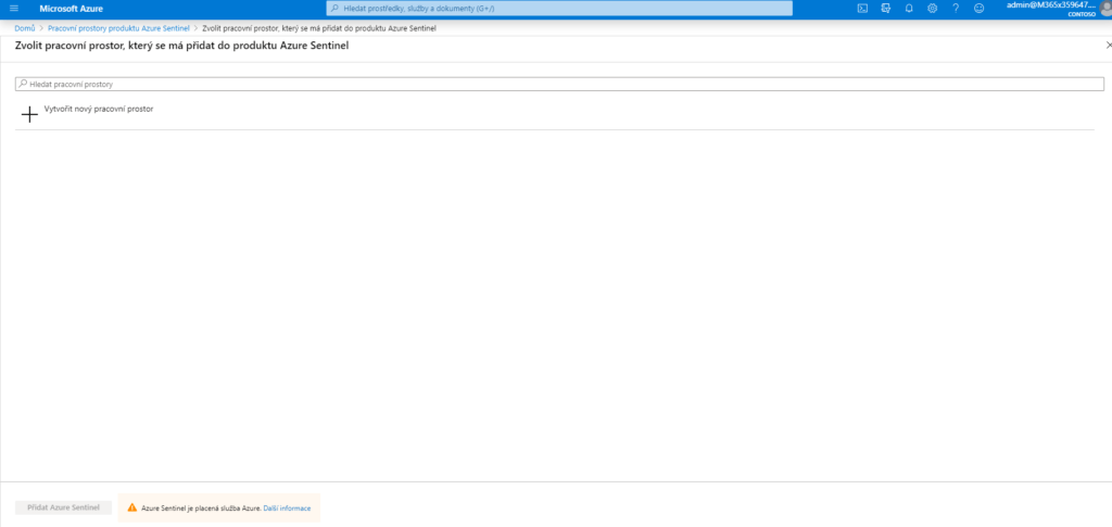 Nyní je nutné zvolit pracovní prostor, do kterého se přidá Azure Sentinel, nebo, pokud ještě nemáte žádný prostor vytvořený, klikněte na tlačítko Vytvořit nový pracovní prostor. V případě, že již máte nějaké pracovní prostory vytvořené, ale požadujete nové prostředí, zvolte tlačítko Přidat a poté Vytvořit nový pracovní prostor.