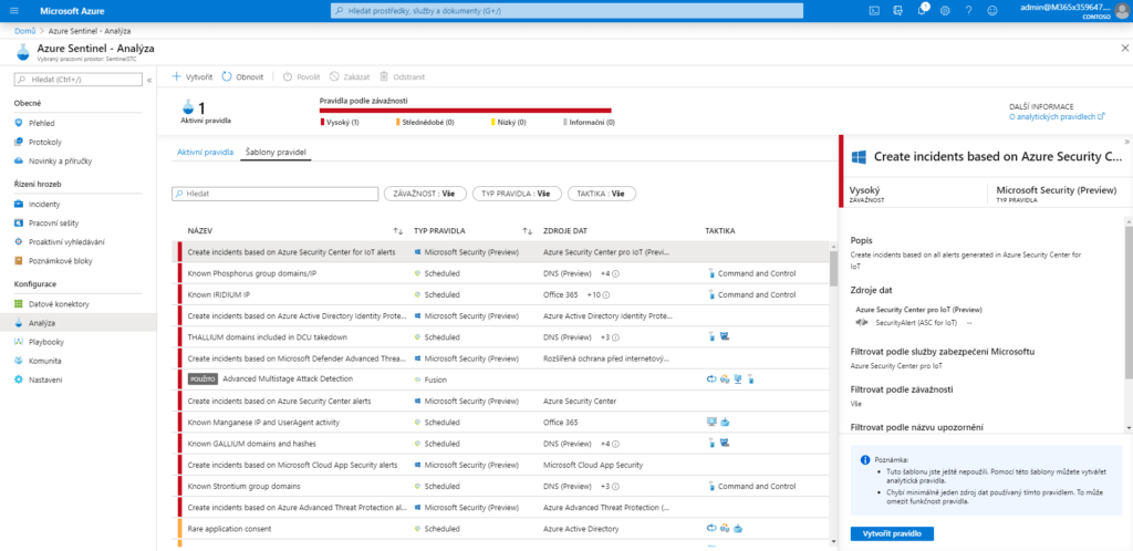 Do Azure analýzy se dostaneme z levé lišty, kliknutím na Analýza. Nás budou zajímat Šablony pravidel – zde můžeme nalézt předvytvořené šablony, které nás upozorní, když se děje něco zvláštního s našimi daty.
