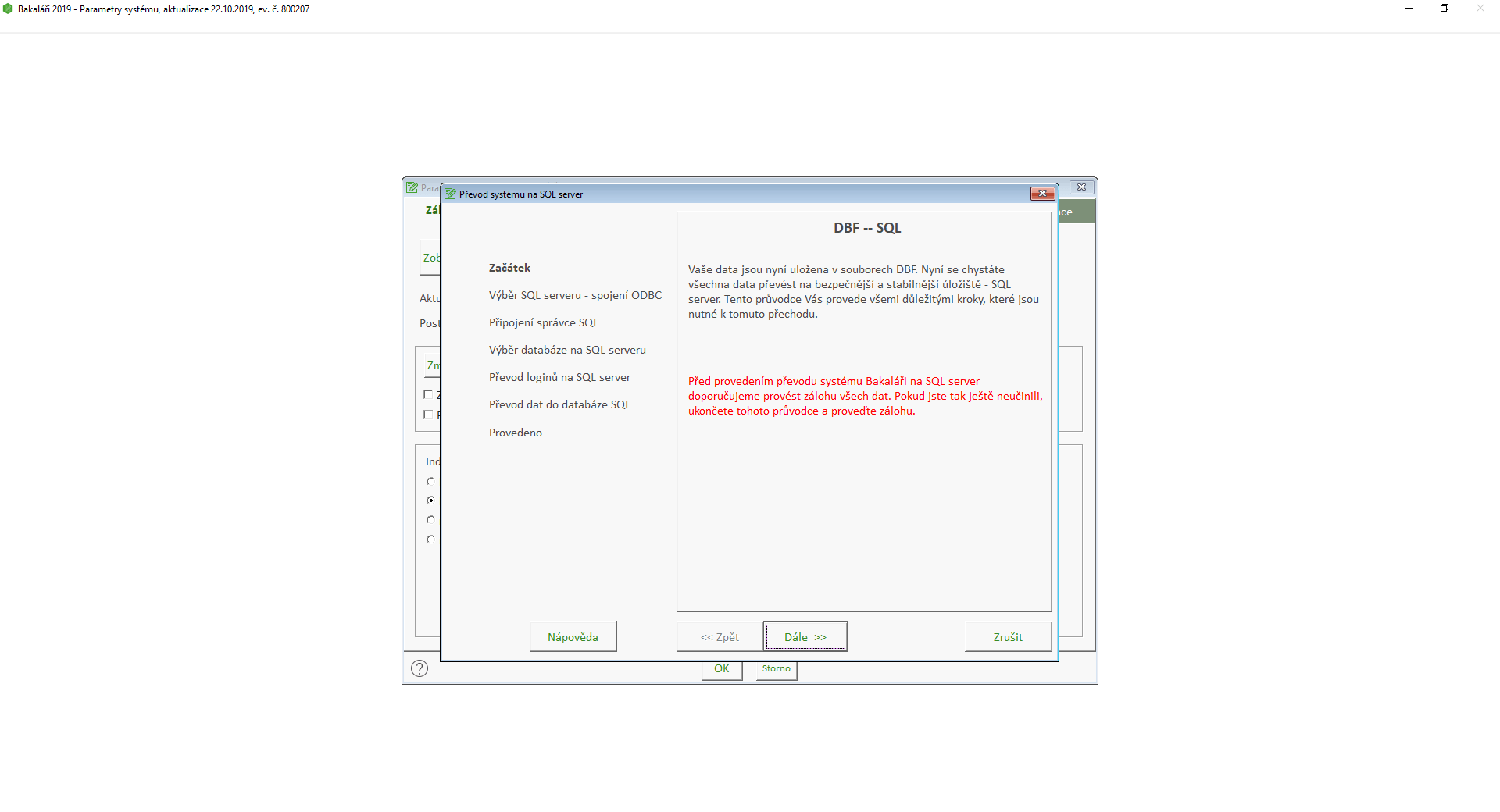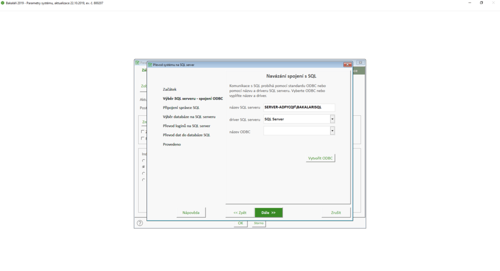 Nyní nastavíme SQL server v systému Bakláři v okně "Parametry systému Bakaláři".