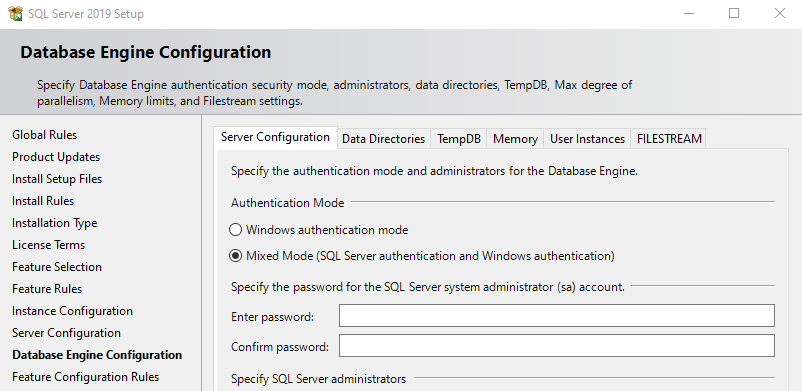 Následně specifikujte heslo. Tato konfigurace vám vytvoří administrátorský účet "sa", který bude mít vámi zvolené heslo. (tento účet později použijete).