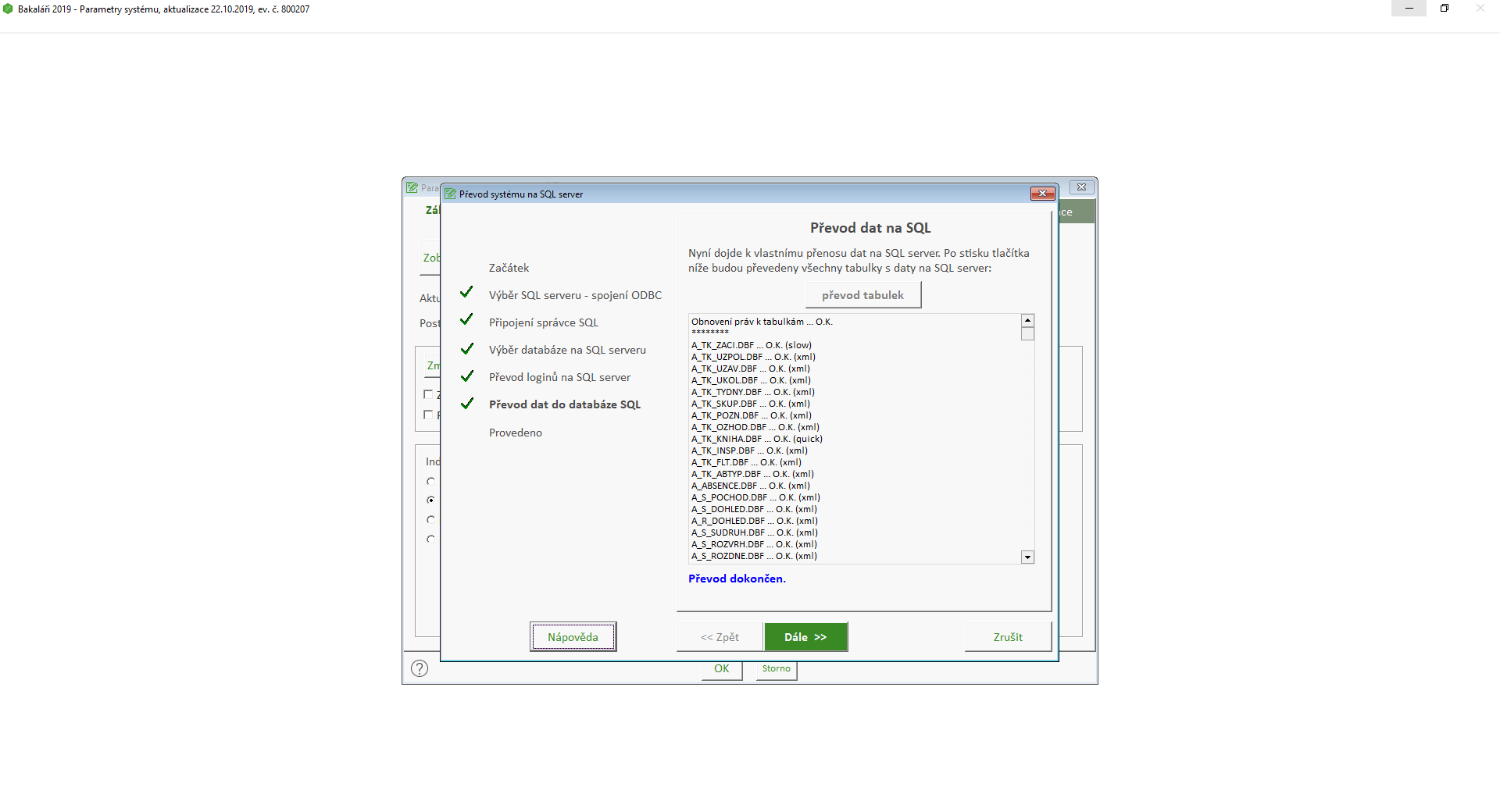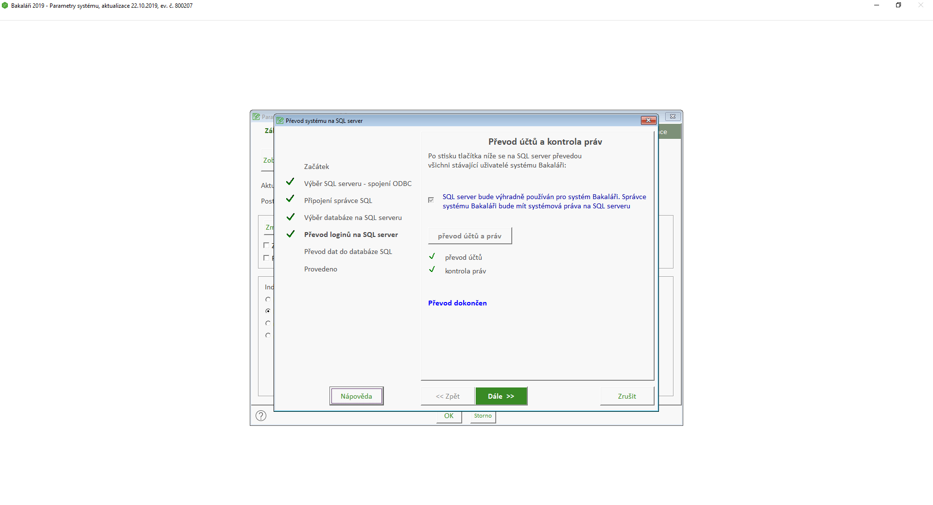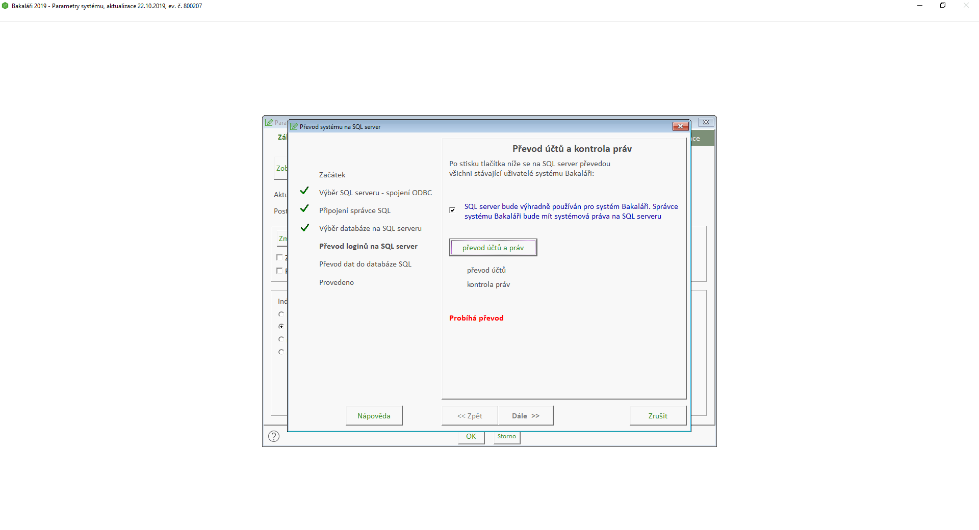 Zde doporučuji zaškrtnout položku "SQL server bude výhradně používán pro systém Bakaláři. Správce systému Bakaláři bude mít systémová práva (sysadmin) na SQL serveru.", poté klikněte na tlačítko pro zahájení převodu.
