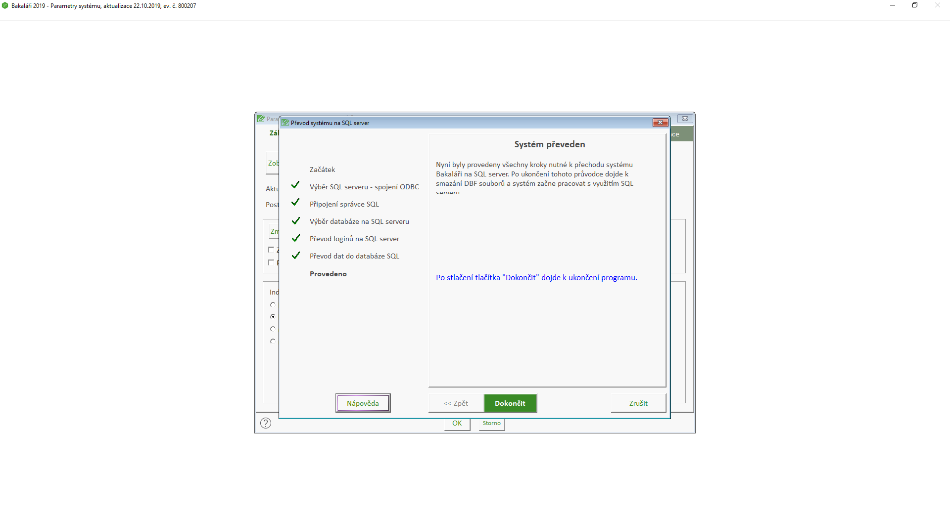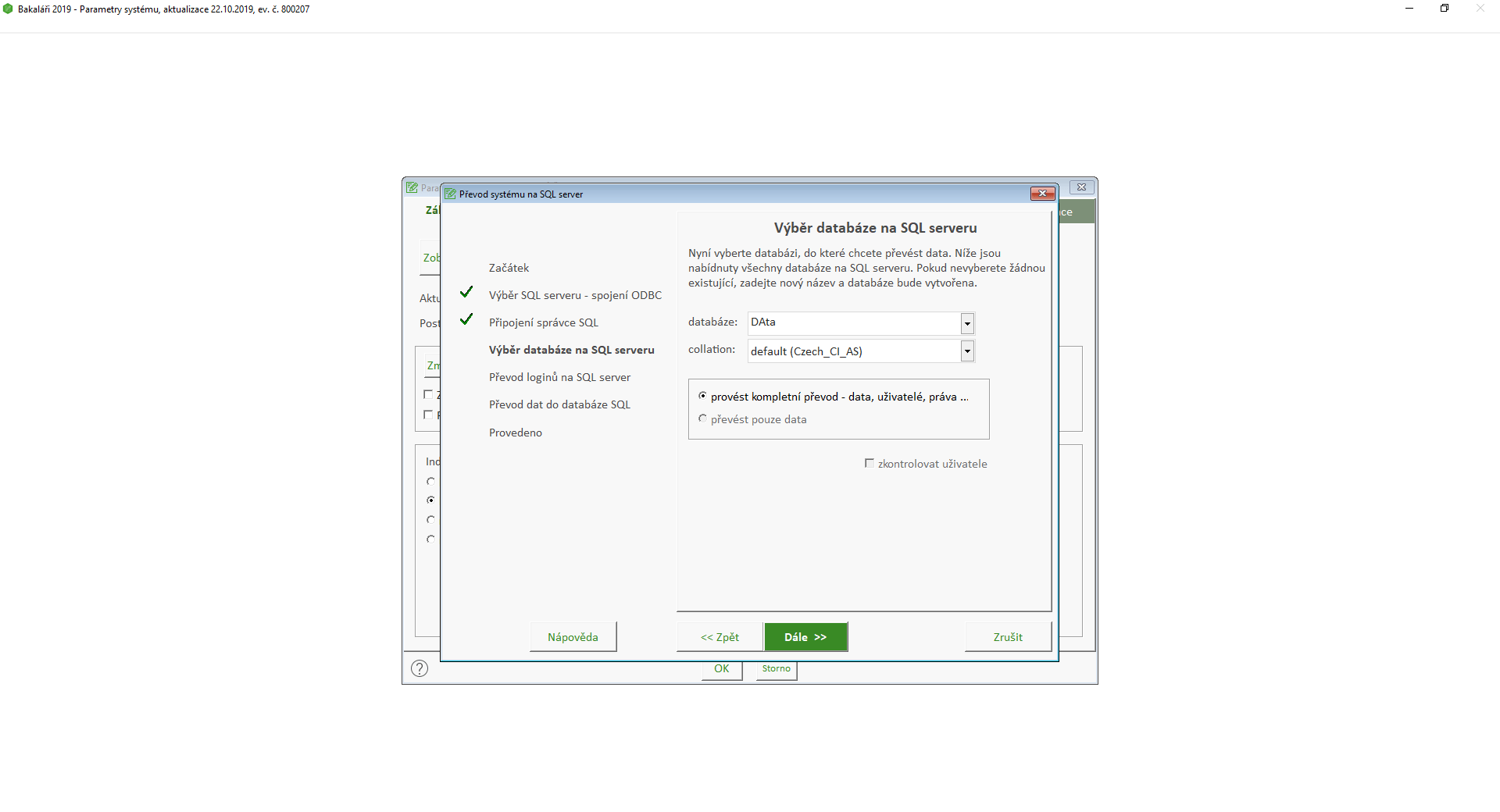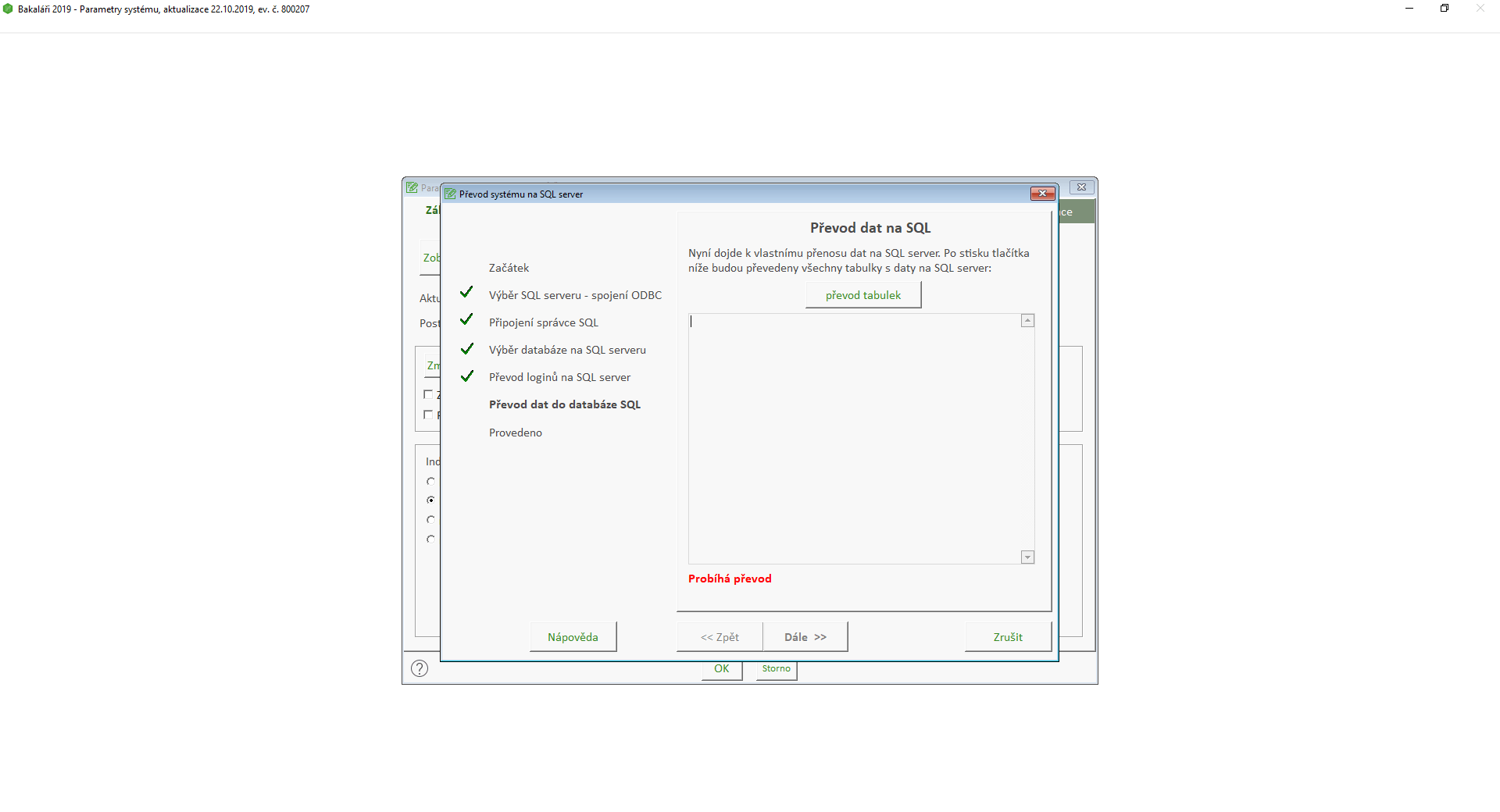 Zde doporučuji zaškrtnout položku "SQL server bude výhradně používán pro systém Bakaláři. Správce systému Bakaláři bude mít systémová práva (sysadmin) na SQL serveru.", poté klikněte na tlačítko pro zahájení převodu.