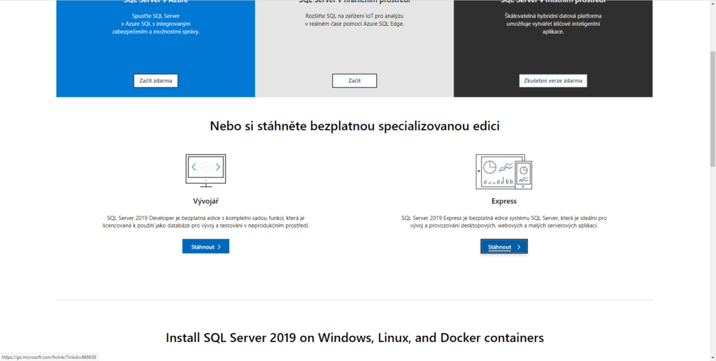 Pro nasazení Bakalářů je nutné mít SQL server nainstalován na vašem virtuální stroji. Stáhnout podporovaný (Microsoft SQL Server) server můžete na stránkách společnosti Microsoft o SQL Serveru (edice Express, která je zcela zdarma).