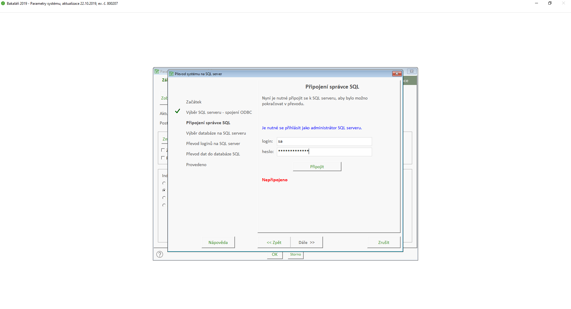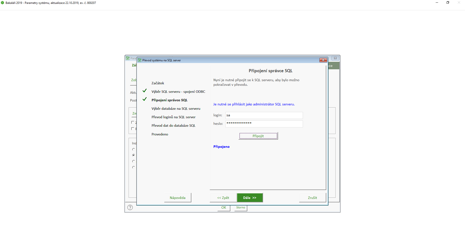 V tomto kroku se přihlásíte pomocí vašeho účtu "sa" a vámi zvoleného hesla vyplněním údajů a kliknutím na "Připojit".