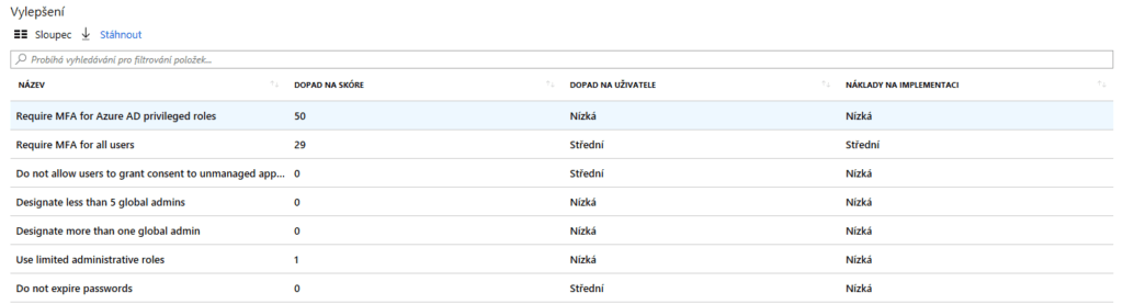 Pod těmito dvěma bloky nalezneme vylepšení, které povedou ke zlepšení našeho zabezpečení a tím i Secure Score. Vylepšení mají různé dopady na skóre, uživatele a náklady na implementaci.
