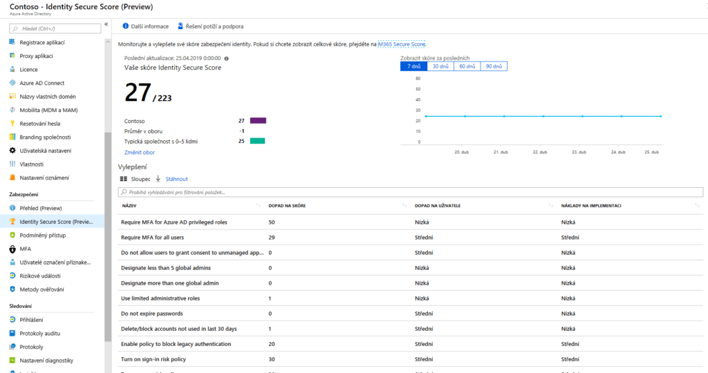 Do Identity Secure Store se dostaneme skrze Azure Active Directory. Na hlavním menu portálu Azure tedy zvolíme Azure Active Directory a zde, v kategorii Zabezpečení, nalezneme Identity Secure Score. Když si Identity Secure Score rozklikneme, vypadá následovně: