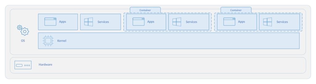 Kontejnery staví na jádru hostitelského operačního systému a obsahují pouze aplikace, některá lehká rozhraní API a služby operačního systému, které běží v uživatelském režimu.