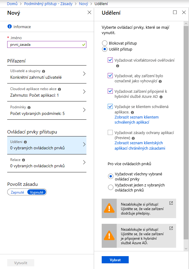Po nastavení podmínek rizika nastavíme Udělení. To určí, zda chceme po uživateli požadovat např. více faktorové ověřování či schválenou aplikaci.