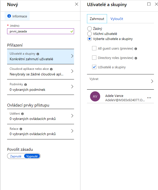 Tady si nejprve novou zásadu pojmenujeme a poté nastavíme. Začneme s uživateli. Zde můžeme zahrnout (nebo vyloučit) žádné, všechny nebo vybrané uživatele (či skupiny).
