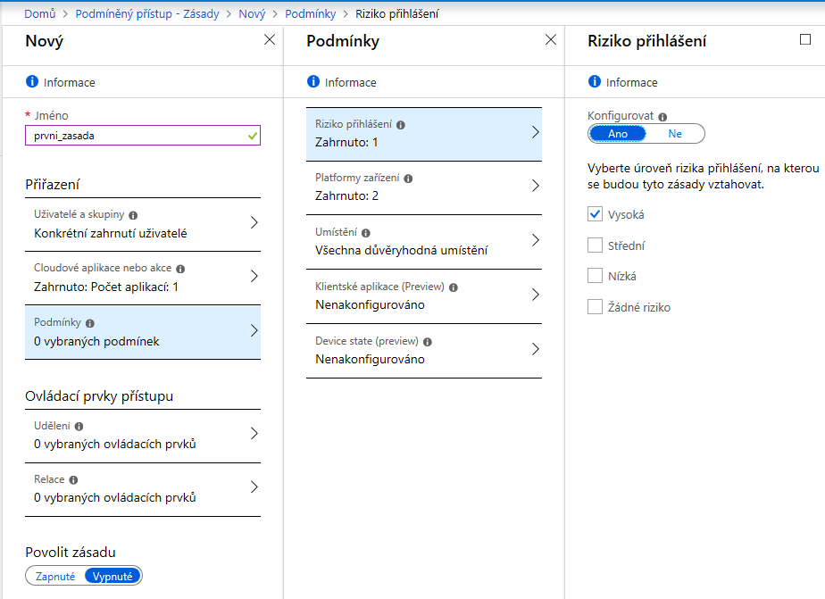 Po aplikacích následuje nastavení podmínek rizika. Na tomto místě vybereme, jak chceme Podmíněný přístup použít (např. na dané platformě, klientské aplikaci či při daném stavu zařízení).