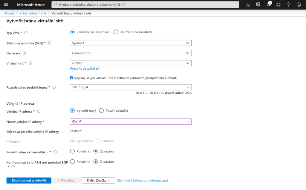 Teď již máte nastavenou podsíť brány a stačí vytvořit samotnou bránu VPN. Na úvodní stránce zadejte do vyhledavače „Brána virtuální sítě“ a přejděte do nastavení. Vytvořte bránu a zadejte všechny potřebné parametry. Vytvoření této brány může zabrat až 45 minut. Tímto je virtuální síť připravena k vytvoření Site-to-Site připojení a zbývá nakonfigurovat bránu místní sítě. Brána místní sítě odkazuje na vaší lokální síť. Bránu můžete vytvořit po vyhledání „Brána místní sítě“. Zde vyplníte všechny potřebné položky, včetně veřejné adresy vašeho VPN zařízení.