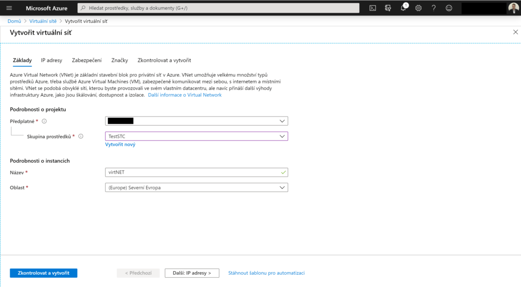 Nejprve je třeba vytvořit virtuální síť. Pokud jste virtuální síť již vytvořili, tak se ujistěte, že se adresní rozsah virtuální sítě nepřekrývá s adresním rozsahem místní sítě, a že sdílený klíč, který jste pro virtuální síť zvolili, je stejný jako ten v místní síti. Pokud nemáte virtuální síť, tak si ji přes Azure portál vytvořte. Stačí k tomu zadat její název, adresní prostor, který se nepřekrývá s místním adresním prostorem, předplatné, které vaše škola používá, skupinu prostředků, umístění podsíť. Virtuální síť si můžete pro snadnější přístup připnout na řídící panel. Dále si můžete nastavit DNS server. Toto není nutné, ale pokud budete pro přístup k prostředkům ve virtuální síti používat písmenné názvy, tak jej budete potřebovat. DNS server se nastaví v kolonce Servery DNS v menu Nastavení ve vaší virtuální síti.