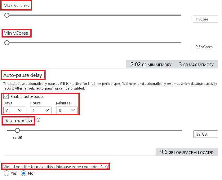 Druhý poddruh z této dvojice je Serverless. Zde, na rozdíl od Provisioned, nemáte veškerý výkon neustále k dispozici. Výkon se škáluje automaticky podle jeho využívání. V nastavení si nakonfigurujete maximální a minimální počet vCores a v tomto rozmezí se budou pohybovat vaše momentální nakonfigurovaná jádra a společně s tím se bude měnit cena, jelikož za tento druh platíte za sekundu použitých vCores. Proto je vhodný pro databáze, ke kterým přistupujete nepravidelně. Nevýhoda tohoto modelu však spočívá v tom, že škálování jader nebo znovuspuštění pozastavené databáze prodlužuje odezvu, proto může být tato databáze pomalejší. Nyní se přesuňme na nastavení tohoto poddruhu.