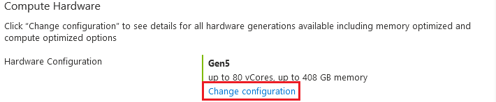 Možná jste si všimli, že jsme celou dobu nevěnovali pozornost jedné možnosti - Hardware configuration. Tuto možnost vlastní každá úroveň vCore-based modelu a proto jsem ho chtěl vysvětlit v odděleném odstavci. V tuto chvíli máte k dispozici 4 generace hardwaru, ale každá je dostupná ve všech úrovních. Pro přístup k tomuto nastavení klikněte na Change configuration v odstavci Change Hardware.
