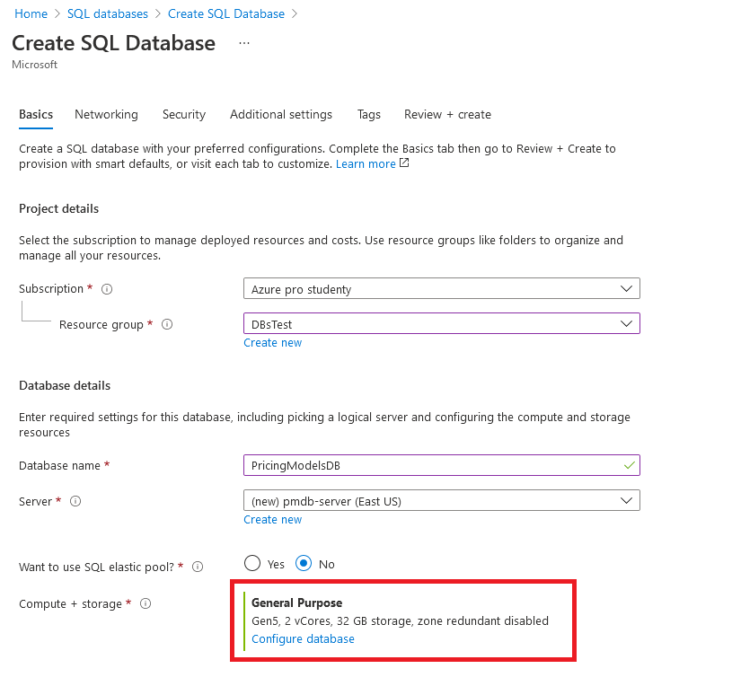 Vybrání správného pricing modelu a jeho nastavení je stěžejní, abyste mohli vaši databázi využívat efektivně. Microsoft používá pro toto nastavení 2 rozdílné sekce a to na DTU-based a vCore-based. Díky tomuto rozdělení může takový databázový server efektivně nastavit jak úplný nováček, tak profík v oboru. Obě sekce vám ukážeme a detailně vysvětlíme. Do nastavení vašeho serveru a vybrání pricing modelu se dostanete pomocí odkazu Configure database v sekci Basics > Database details > Compute + storage.