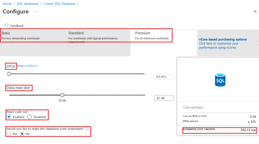Hned nahoře se nachází první volba - zvolení úrovně tohoto modelu. Jsou zde na výběr tři - Basic, Standard a Premium. Pro málo používané nebo nedůležité databáze je vhodné zvolit nejslabší možnost, Basic. Pro velmi často používané a důležité databáze, kdy potřebujete mít velmi nízkou odezvu, je vhodné zvolit úroveň Premium. Standard je takový zlatý střed.