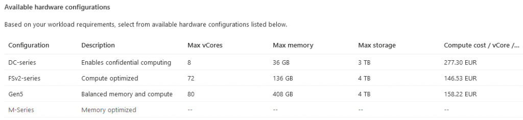 Tyto generace jsou zapsány v tabulce, která obsahuje sloupce společně s jejich výkonem. Můžete v ní zjistit, na co se každá generace hodí ve sloupci Description, maximální možný počet vCores, paměti a úložiště pomocí sloupců Max vCores, Max memory a Max storage. Poslední sloupec Compute cost/vCore/second obsahuje cenu za jedno virtuální jádro za sekundu. Všechny hodnoty zůstávají stejné ve všech úrovních. Mění se pouze jejich cena. Nejlevnější najdete v úrovni General Purpose a nejdražší v Business Critical.