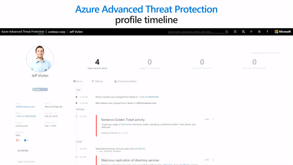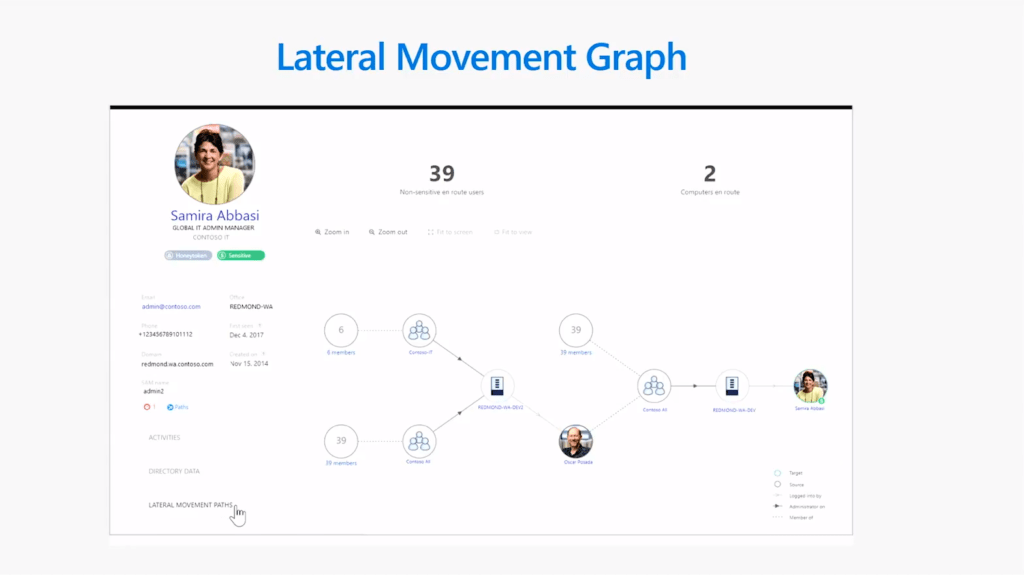Běžně jsou útoky prováděny skrz všechny dostupné entity, jako je např. uživatel s nízkými oprávněními, a poté se rychle pohybují, dokud útočník získá přístup k cenným prostředkům – např. Citlivým údajům, správcům domény a vysoce citlivým datům. Azure ATP identifikuje tyto hrozby už v době jejich vzniku.
