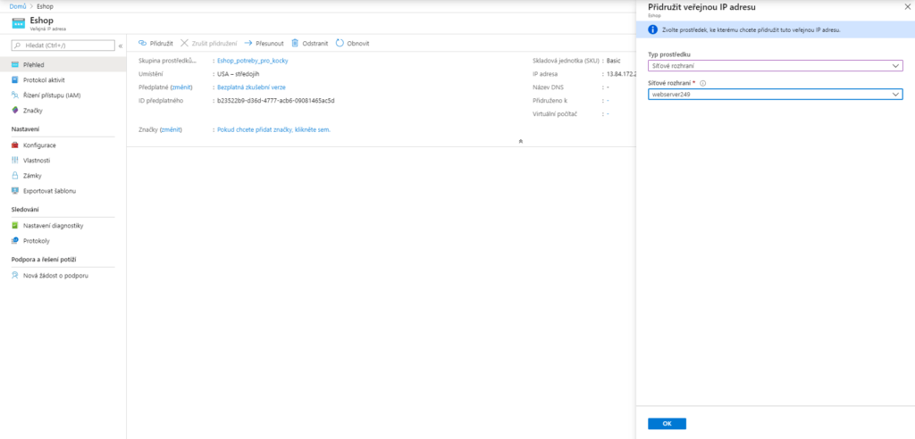 Vytvořenou IP adresu lze přímo přiřadit k existujícímu prostředku (například virtuálnímu počítači, nebo webové aplikaci). Můžete to udělat po kliknutí na příslušnou adresu a tlačítko "Přidružit".