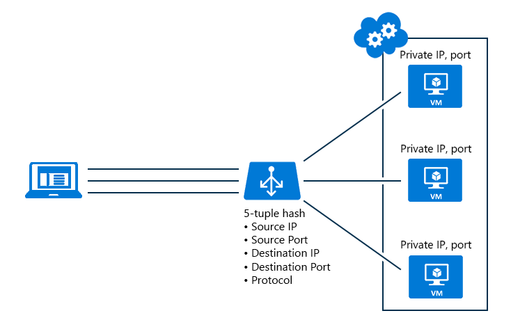 S Azure Load Balancerem můžete vytvořit pravidla vyrovnávání zátěže, která slouží pro distribuci dat v reálném provozu, který je veden v rámci front-end a back-end. Při distribuci příchozích datových toků se využívá algoritmus na základě hodnoty hash a odpovídajícím způsobem přepisuje hlavičky datových toků do prostředků back-end. Server je k dispozici pro příjem nových datových toků, jakmile se určí funkční koncový bod pomocí stavu, v rámci sondy, v back-end. Ve výchozím nastavení používá k mapování datových toků na dostupné servery hodnotu hash, konkrétněji seřazená kolekce 5 členů: zdrojová IP adresa, zdrojový port, cílová IP adresa, cílový port a číslo protokolu IP. Všechny pakety (data) ze stejného toku paketů (dat) se doručí do stejného prostředku (front-end). Když klient zahájí nový tok paketů (dat) ze stejné zdrojové IP adresy, změní se zdrojový port. Řazená kolekce 5 členů tak ve výsledku může způsobit přesměrování provozu do jiného koncového bodu back-end. (viz. obrázek)