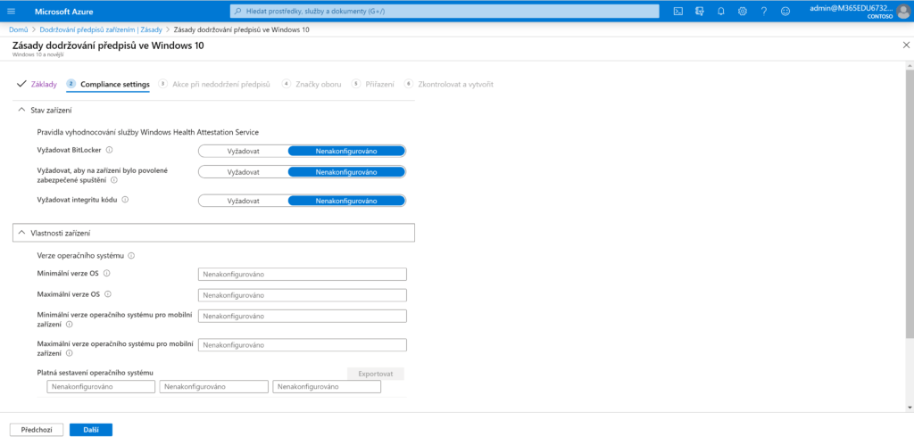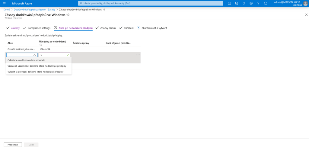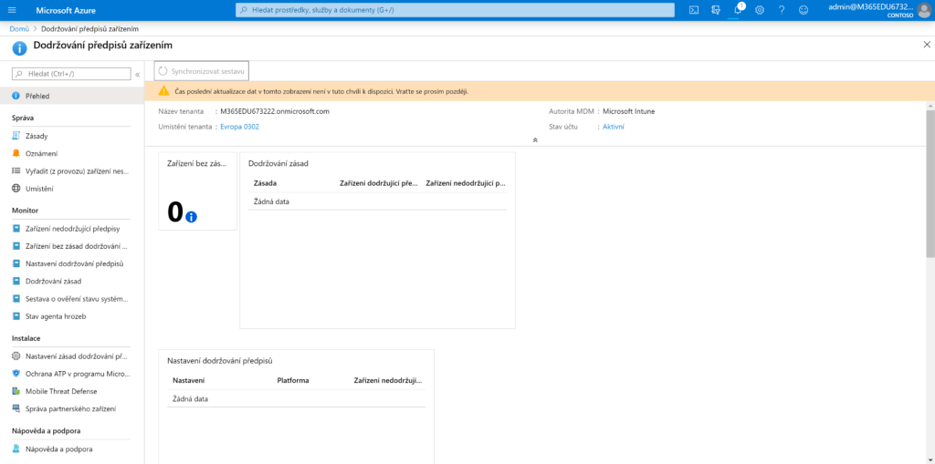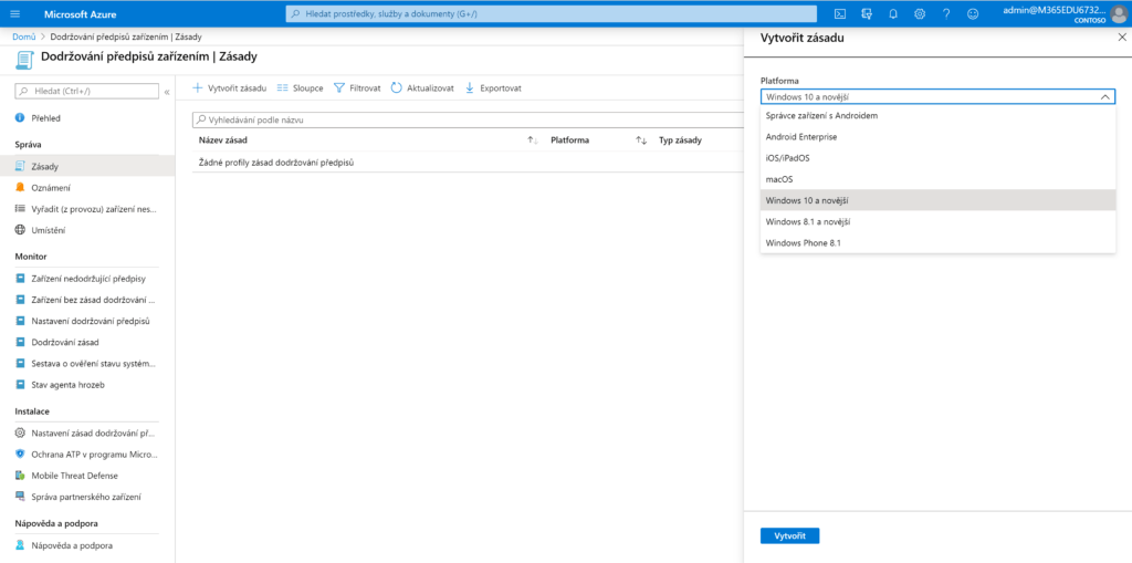 Zásady dodržování předpisů je název funkce v Intune definující pravidla a nastavení, které uživatelé a zařízení musí splnit. V kombinaci s podmíněným přístupem správci mohou blokovat zařízení, která předpisy nesplňují. Díky této funkci totiž lze monitorovat stav dodržování předpisů. Jako příklad předpisu zde můžeme uvést nutnost používání hesla pro přístup k datům nebo omezený výběr verzí operačního systému.