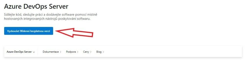 - Přejdeme na stránky Azure DevOps serveru, kde klikneme na tlačítko „Vyzkoušet na 90denní bezplatnou verzi“