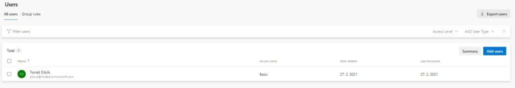V této sekci si jako první můžete všimnout, že jsou zde vypsaní uživatelé pod sebou. Uživatele můžete rovnat podle jména, Access Levelu, datumu přidání, posledního přihlášení. Pokud si na uživatele kliknete, tak se vám úplně vpravo objeví 3 tečky, na které když si kliknete, rozjede se vám menu, které vám umožní upravovat uživatele a jeho pravomoce v organizaci. Vpravo nahoře jste schopni si uživatele exportovat, filtrovat a poté i přidat. Pokud chcete přidat uživatele do organizace, musíte mu poslat pozvánku na email. Také si všimněte, že vlevo nahoře se můžete přepnout na možnost "Group roles". Zde jste schopni nastavovat týmy a pravomoce mezi všemi projekty pod danou organizací.