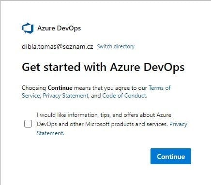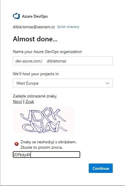 Na této stránce vyplňte informace, dle vašeho uvážení, a klikněte vpravo dole na tlačítko Continue, v češtině Pokračovat. Jak si můžete všimnout, tak vám to automaticky založilo organizaci na Azure DevOps, v mém případě je název této organizace "pokus0763". Můžete si ověřit, že vše proběhlo správně tím, že půjdete na dev.azure.com a kouknete se doleva nahoru.