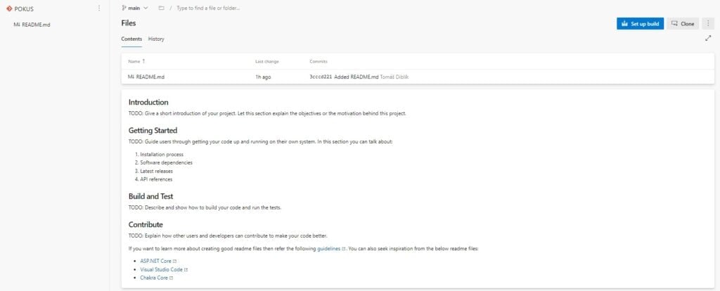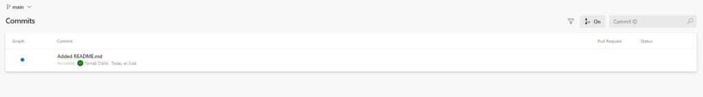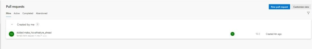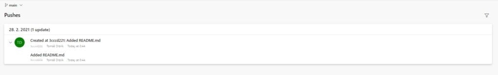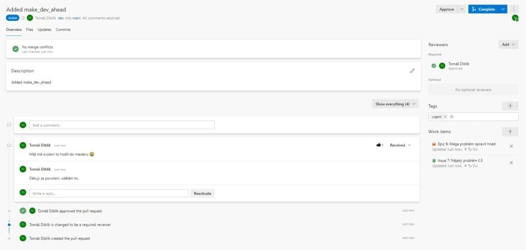 Ve vrchní části vidíte informace o pull requestu, napravo jsou pomůcky na dokonání pull requstu a dole jsou komentáře a akce. Jak si můžete všimnout, tak prvně byl vytvořen pull request, poté byl přidat "Tomáš Diblík" jako povinný kontrolor. Jakmile zkontroloval kód, zmáčknul vpravo nahoře "Approve" a tím dal možnost původnímu žadateli dokončit pull request. Jakmile měl žadatel povolení, tak kliknul na tlačítko "Complete" vpravo nahoře a dokončil tím pull request. Pull request se poté přidal do dokončených pull requestů.